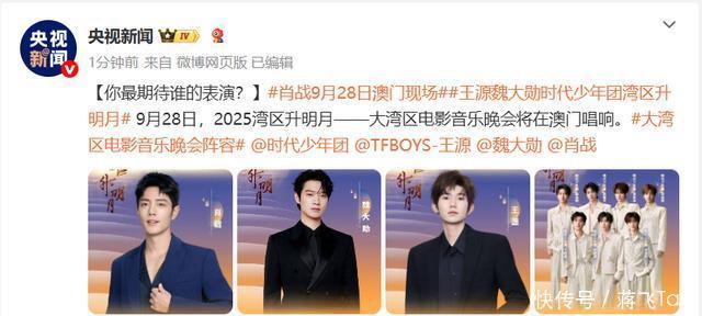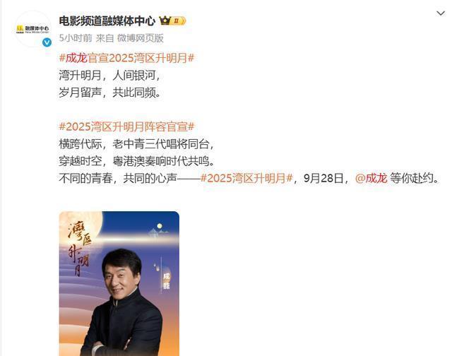 9月28日,2025湾区升明月——大湾区电影音乐晚会将在澳门唱响。 今天(25日)下午,@电影频道融媒体中心发文:#成龙官宣2025湾区升明月。